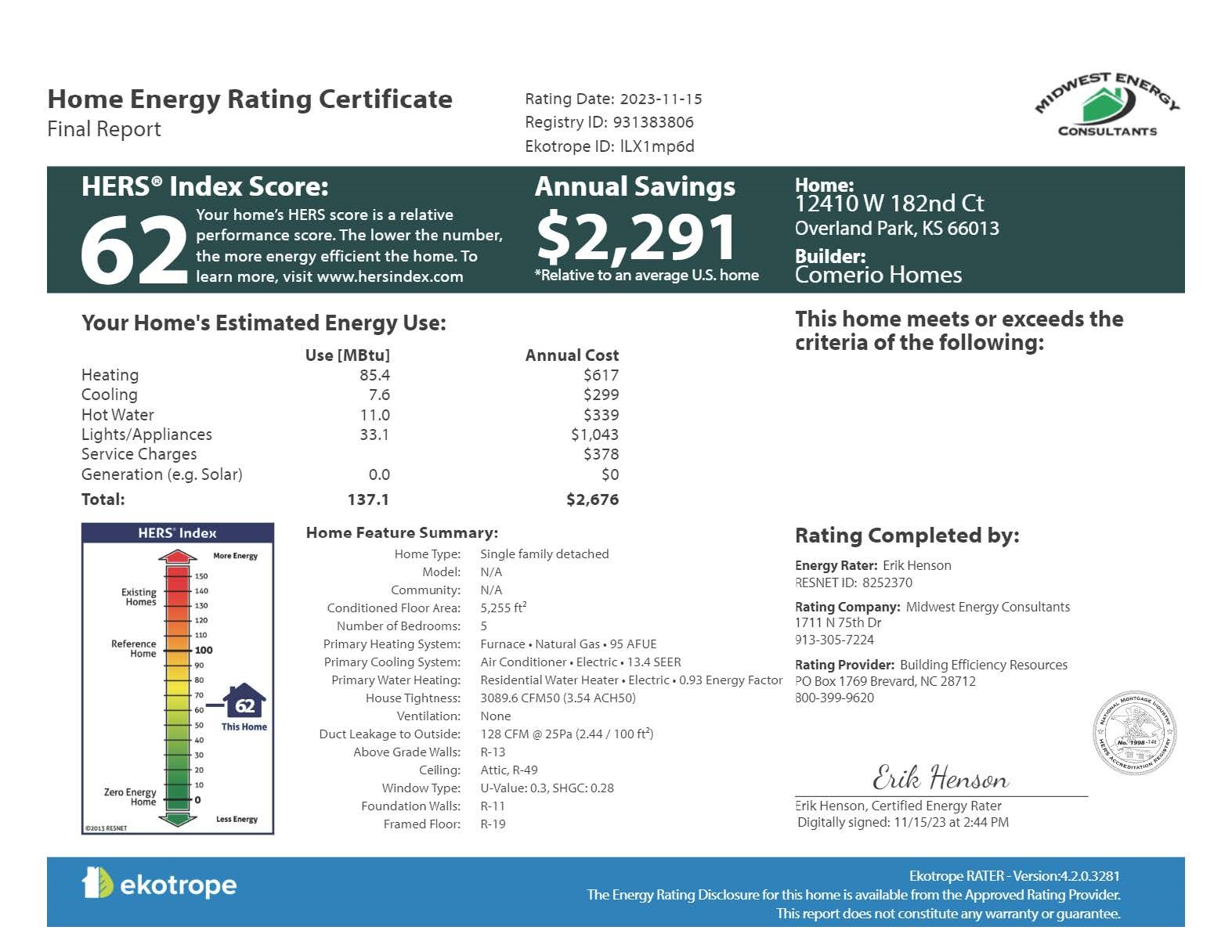 - One recent audit showed an estimated annual energy savings of $2,291 compared to a typical existing home.